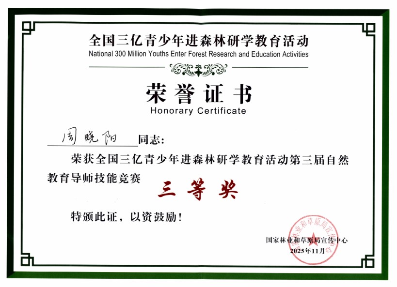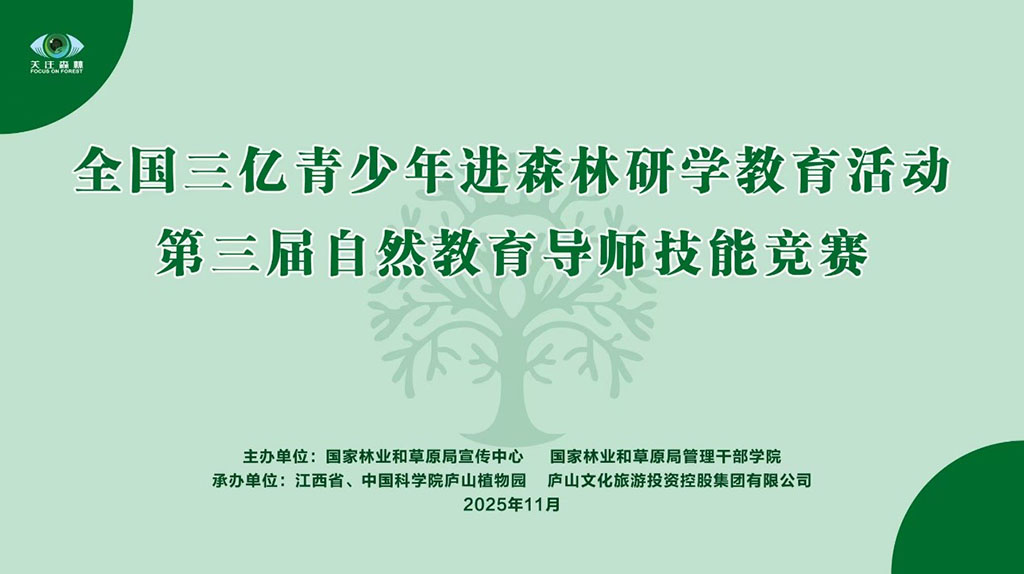 2025年11月5日,由国家林业和草原局宣传中心和国家林业和草原局管理干部学院主办,江西省、中国科学院庐山植物园和庐山文化旅游投资控股集团有限公司承办的全国三亿青少年进森林研学教育活动第三届自然教育导师技能竞赛在庐山植物园圆满落幕。来自全国各自然?;で蜃匀唤逃喙氐ノ坏?3位参赛选手,聚焦自然教育这一主题,从“自然教育项目策划”和“自然教育现场教学”两个部分展开激烈比拼。