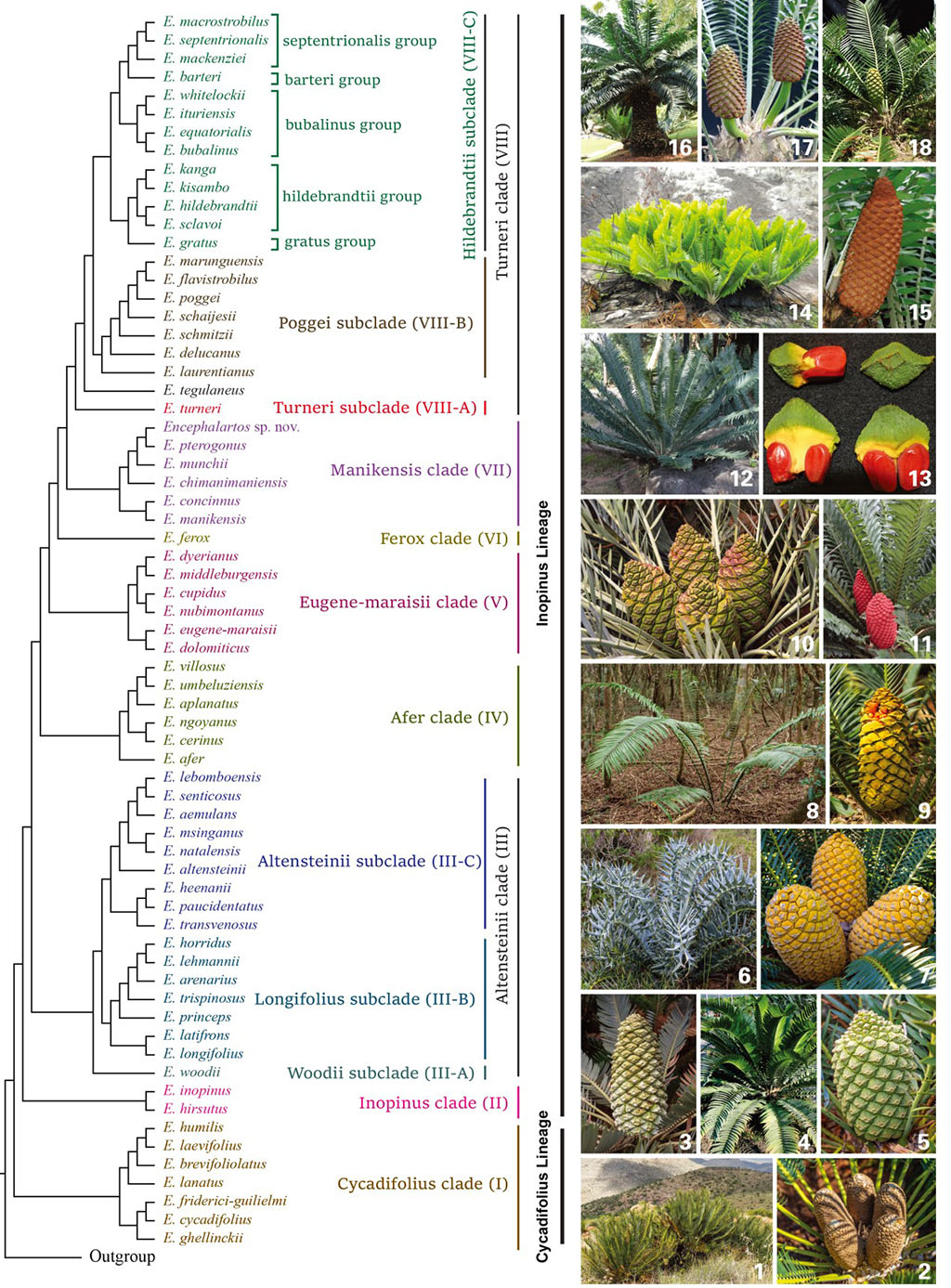 图1. 非洲铁属的系统发育关系。研究中确定的主要分支如左图所示,其代表物种则在右图中展示。各分支及其代表物种如下:Cycadifolius Clade: (1) E. cycadifolius (Jacq.) Lehm., and (2) E. laevifolius Stapf & Burtt Davy; Inopinus Clade: (3) E. hirsutus P. J. H. Hurter; Altensteinii Clade: (4) E. woodii Sander of woodii subclade, (5) E. trispinosus (Hook. f.) R. A. Dyer and (6) E. horridus (Jacq.) Lehm. of longifolius subclade, (7) E. lebomboensis I. Verd. of altensteinii subclade; Afer Clade: (8) E. villosus Lem. and (9) E. cerinus Lavranos & D. L. Goode; Eugene‐maraisii Clade: (10) E. middelburgensis Vorster, Robbertse & S.van der Westh; Ferox Clade: (11) E. ferox G. Bertol; Manikensis Clade: (12) E. concinnus R. A. Dyer & I. Verd. and (13) E. chimanimaniensis R. A. Dyer & I. Verd.; Turneri Clade: (14) E. turneri Lavranos & D. L. Goode, (15) and (16) E. gratus Prain of turneri subclade, (17) E. barteri Carruth. ex Miq of hildebrandtii subclade, (18) E. delucanus R. A. Dyer & I. Verd. of poggei subclade