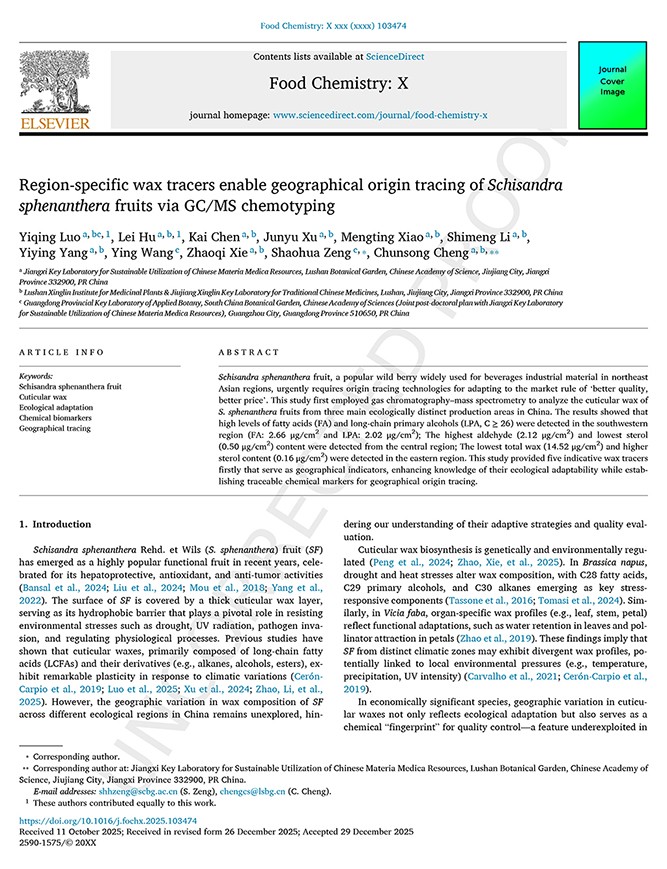 近日,江西省、中国科学院庐山植物园程春松博士和华南国家植物园曾少华博士团队联合攻关,在中科院一区国际权威期刊《Food Chemistry: X》发表的研究中给出了答案 —— 南五味子果皮表面的角质层蜡质,正五味子应对不同环境挑战的 “智能防护盾”!通过气相色谱 - 质谱(GC-MS)技术,研究团队系统解析了云南、四川、广西、陕西、河南、安徽六大产区中药南五味子的蜡质成分,首次揭示了蜡质组成与生态环境的精准适配关系。