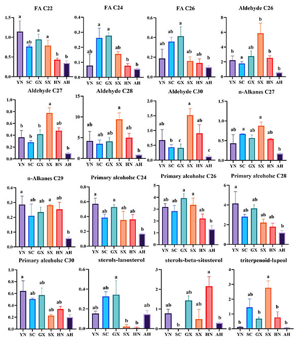Fig. 2. Comparison of (a) hentriacontane, (b) n-tritriacontane, (c) n-pentatriacontane, (d) dotriacontane, and (e) n-tetratriacontane wax contents of SF from six production areas (YN, GX, SC, SX, HN, and AH). Different lowercase letters indicate significant differences, p< 0.05, Tukey’ s HSD).