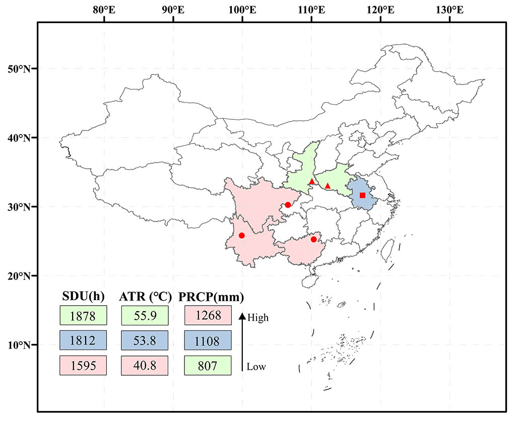 Fig. 3. The geographical locations of the six production areas of SF, as well as the sunshine duration (SDU), annual temperature range (ATR), and annual precipitation (PRCP) dates (the red background represents the southwest region, the green background represents the central region, and the blue background represents the eastern region).