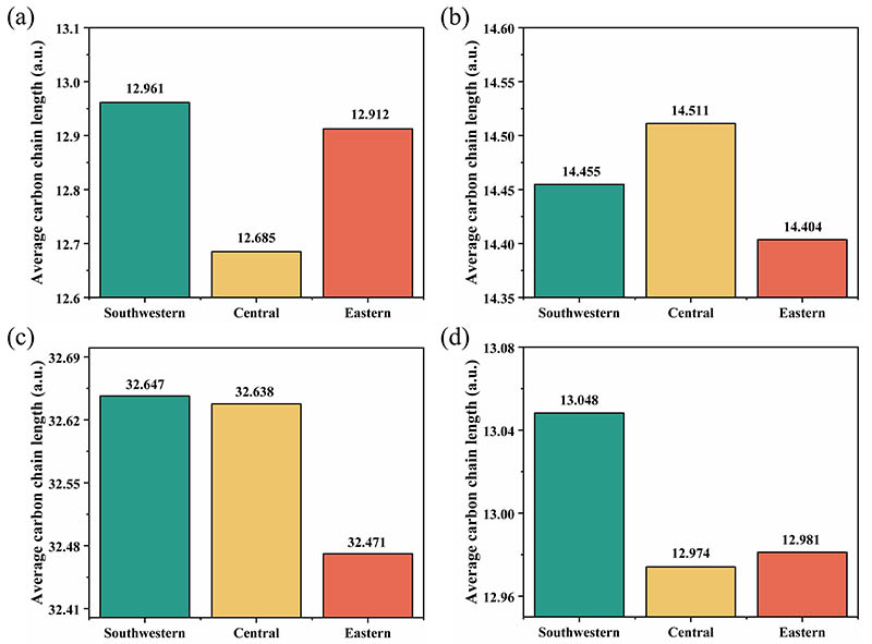 Fig. 4. Average carbon chain length of (a) total fatty acid, (b) total aldehyde, (c) total n-alkane, and (d) total primary alcohol in southwestern (green bar), central (yellow bar), and eastern (red bar) regions.