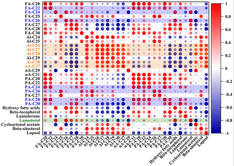 图5. 6个南五味子产区的表皮蜡质成分相关热图(热图突出了区域特定的蜡分布:蓝色为西南组特异性蜡质,橙色为中部组特异性蜡质,绿色为东部组特异性蜡质)。FA:脂肪酸,Al:醛,nA:正构烷烃,PA:伯醇)。