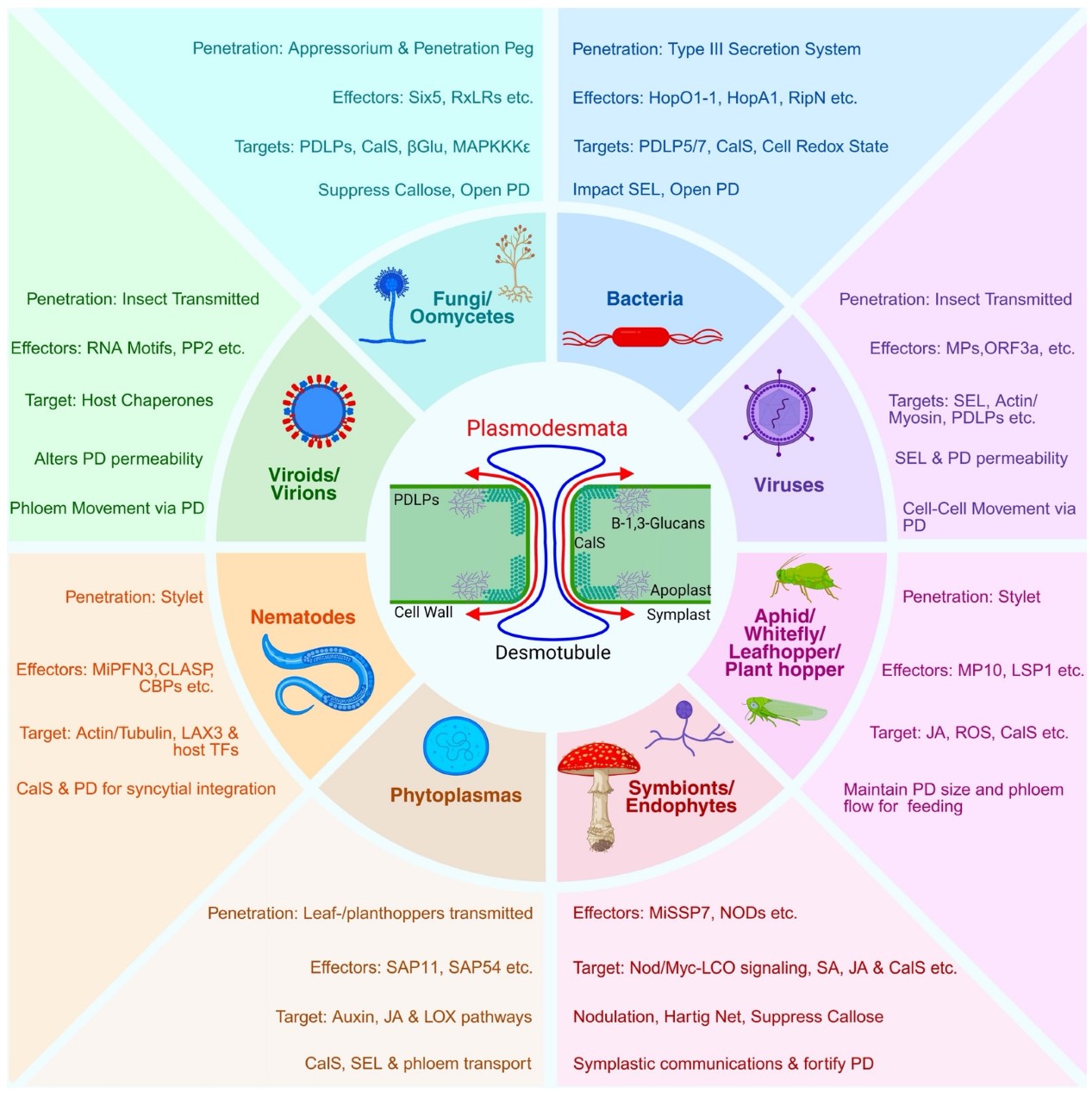 图1. Effector strategies used by insects, microbes and mutualists to alter plasmodesmata: a cross-kingdom view of symplastic connectivity.