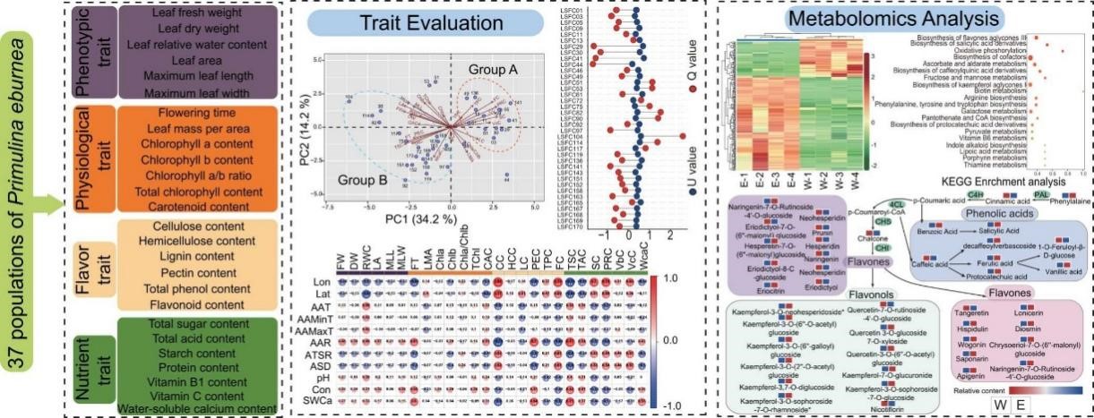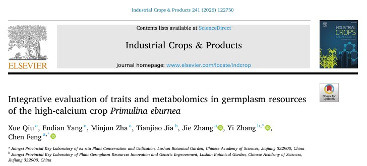 种质资源评价是野生植物资源利用与驯化的首要步骤。近日,庐山植物园冯晨副研究员团队在国际知名期刊《Industrial Crops & Products》发表题为"Integrative evaluation of traits and metabolomics in germplasm resources of the high-calcium crop Primulina eburnea"的文章,该研究完成了对牛耳朵(Primulina eburnea)野生种质资源的综合评价,建立了核心种质库,并揭示了其东西部种群在关键性状和代谢物上的显著差异,为牛耳朵作为新一代植物源钙补充剂的育种与产业化开发提供了科学依据和宝贵资源。
