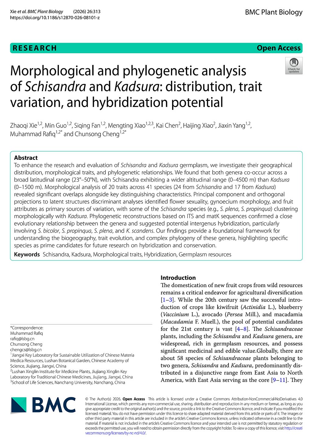 2026年1月21日,江西省、中国科学院庐山植物园程春松、谢钊启团队在国际学术期刊《BMC Plant Biology》(中科院二区TOP,5-yr IF: 5.4)上发表了题为“Morphological and phylogenetic analysis of Schisandra and Kadsura: distribution, trait variation, and hybridization potential”的研究论文。该研究系统解析了两属植物的地理分布规律、形态特征分化机制及种间杂交潜力,厘清了其进化亲缘关系,并创新性提出跨属历史杂交假说,为五味子科植物的种质资源精准鉴定、优质品种分子育种及野生资源?;だ锰峁┝斯丶睦砺壑С庞爰际醪慰肌?/p>