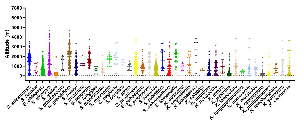 图1. 五味子属(Schisandra)与南五味子属(Kadsura)的全球海拔梯度分布格局