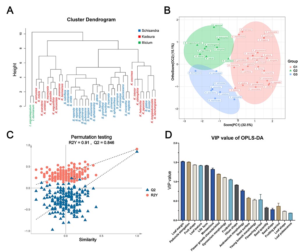 图2. 基于潜在结构的正交偏最小二乘判别分析(OPLS-DA)模型在南五味子属与五味子属多性状聚类中的应用。(A)基于20个形态性状戈氏距离构建的非加权组平均法(UPGMA)聚类树状图,展示南五味子属与五味子属类群间的表型亲缘关系;(B)基于形态性状的正交偏最小二乘判别分析将41个物种清晰聚为3个类群,分别标记为G1、G2和G3;(C)正交偏最小二乘判别分析置换检验图,其中R2和Q2分别代表模型的解释度与预测能力,可用于判别模型优劣;(D)投影重要性指标(VIP)图,用于综合评价各变量的贡献度,该图按指标值从大到小排序,数值较大的变量展示于图左侧。