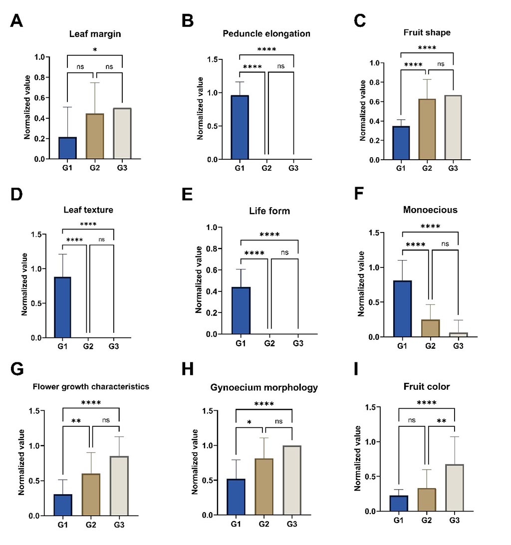 图3,五味子属与南五味子属不同类群形态性状差异分析。(A)叶缘;(B)花梗伸长程度;(C)果实形状;(D)叶质地;(E)生活型;(F)雌雄同株特性;(G)花着生特性;(H)雌蕊形态;(I)果实颜色。(样本数 N > 8;采用 Tukey 多重比较检验,**** p < 0.0001 表示极显著差异;*** p < 0.001 表示高度显著差异;** p < 0.01 表示显著差异;* p < 0.05 表示轻度显著差异;ns 表示无显著差异)。