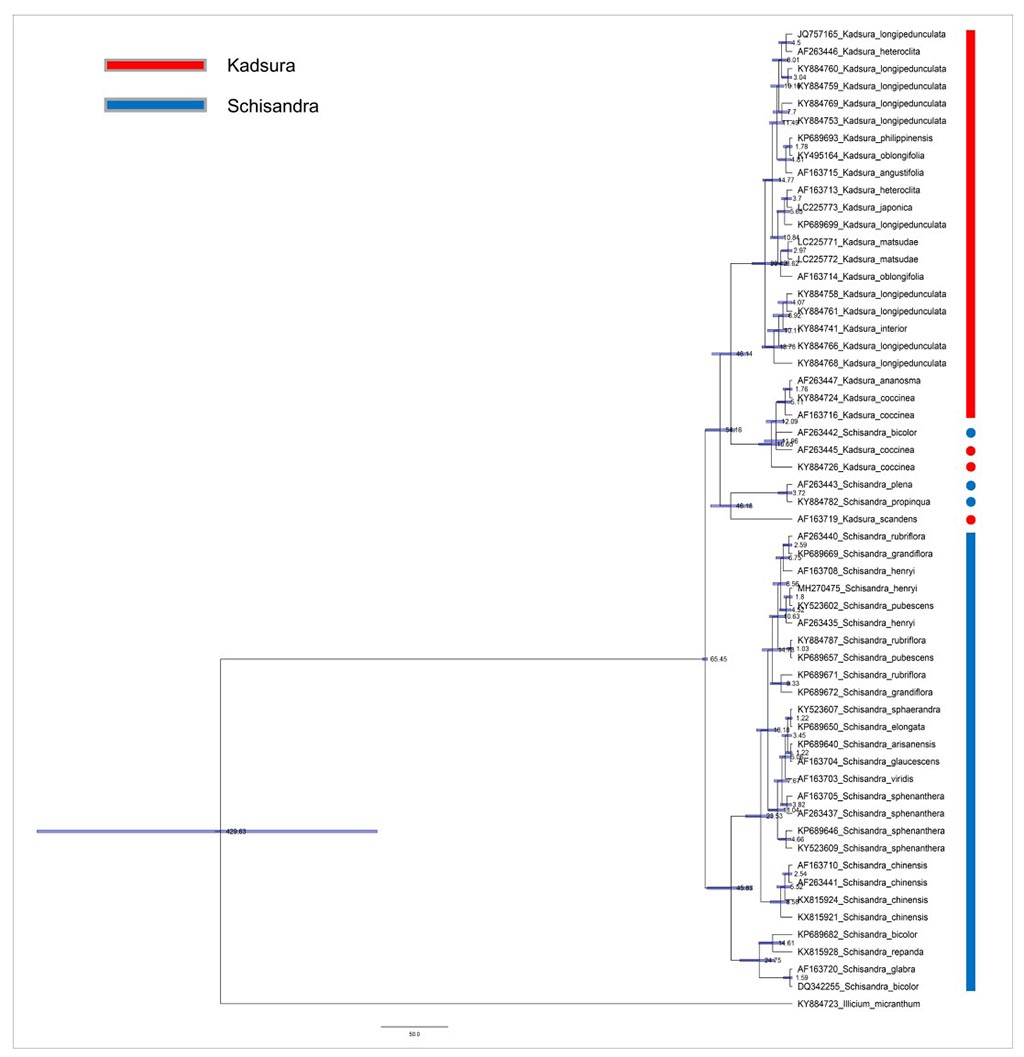 图4. 基于ITS序列的Schisandra属和Kadsura属贝叶斯分子钟分析。