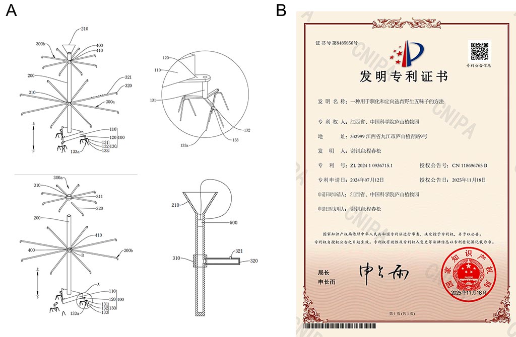 基于上述论文的核心研究成果,团队快速推进基础研究与产业应用的深度衔接,针对性设计五味子驯化与定向选育技术方案并成功申报发明专利,该专利已于2025年11月18日获得授权(专利名称:一种用于驯化和定向选育野生五味子的方法;专利号:ZL 2024 1 0936715.1)。论文明确的不同物种生长环境适配性、藤本生长特性及形态特征等结论,为专利技术的精准设计提供了核心科学依据:专利创新设计含防风底座的双层标准化栽培架,精准匹配五味子藤本攀援生长需求;通过“结果母枝与营养枝递进式替换”的核心管理策略,搭建稳定的定向选育体系;同时配套土壤pH值调控(5.5-7.0)、精准施肥等措施,有效解决了传统栽培中支架易倒伏、管理低效、产量品质不稳定等痛点,实现了从基础理论研究到实用技术突破的无缝衔接。