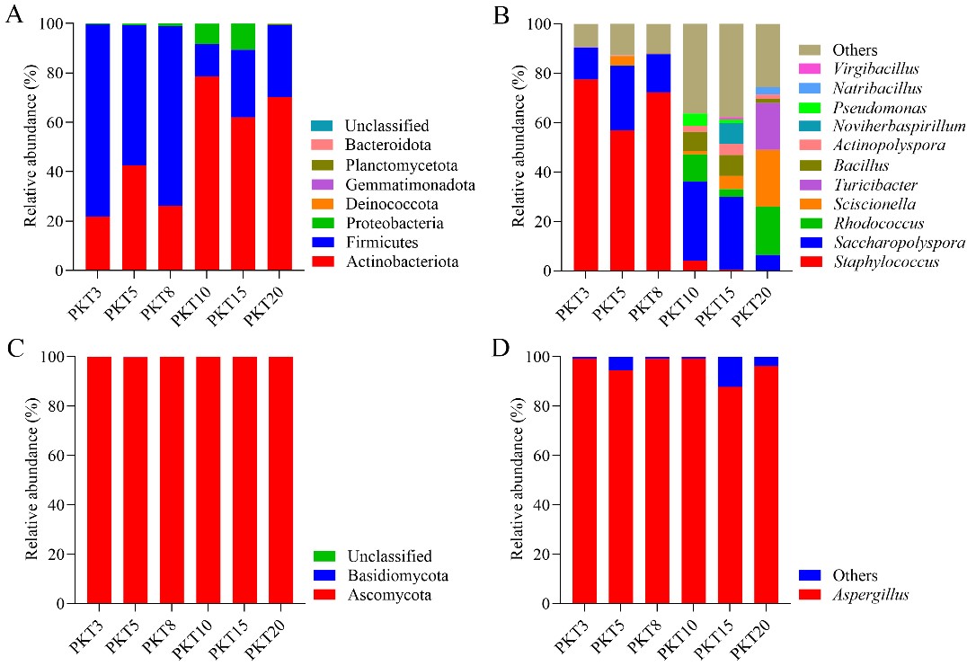 微生物群落演替分析显示,蒲坑茶陈化过程中存在显著的微生态阶段性变化。细菌群落方面,早期以Firmicutes(厚壁菌门)为主,Staphylococcus(葡萄球菌属)相对丰度较高;随储藏时间延长,Actinobacteriota(放线菌门)占比逐步上升,Saccharopolyspora(糖多孢菌属)在中期持续发挥重要作用,形成“阶段接力”的演替模式。真菌群落则以 Aspergillus(曲霉属)为长期优势类群,贯穿陈化全过程,推测其持续参与物质转化,是调控风味成熟的核心功能性真菌。