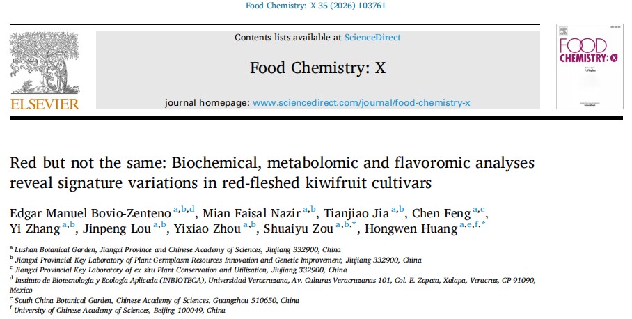 近日,庐山植物园特色果树资源驯化与改良研究组在国际期刊《Food Chemistry: X》上发表题为“Red but not the same: Biochemical, metabolomic and flavonomic analyses reveal signature variations in red-fleshed kiwifruit cultivars”的研究论文,系统揭示了三种代表性红肉猕猴桃品种在色泽、营养、香气等方面的代谢基础差异,为红肉猕猴桃的品种改良与功能开发提供了重要理论依据。